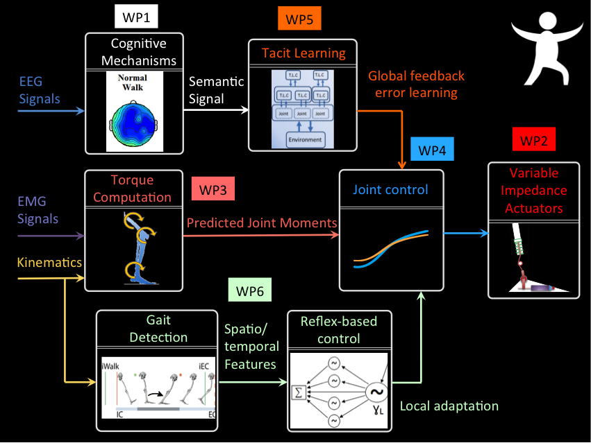 The final goal of the project is to deliver novel ambulatory wearable exoskeleton technology that exploits neuronal control and learning mechanisms and provides a) more energy efficient cooperative (human-robot) performance, and b) adaptive assistance based on the user's residual and voluntary action.